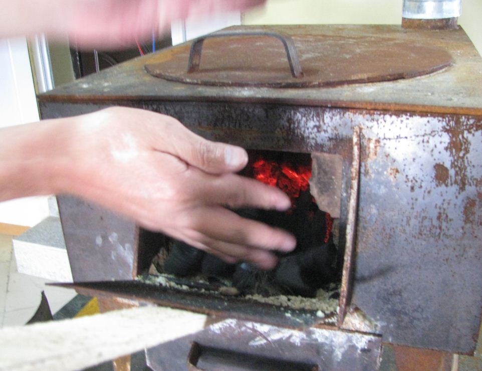 56 A few hot coals remain. Put on some small pieces of wood to re-establish the flame.JPG